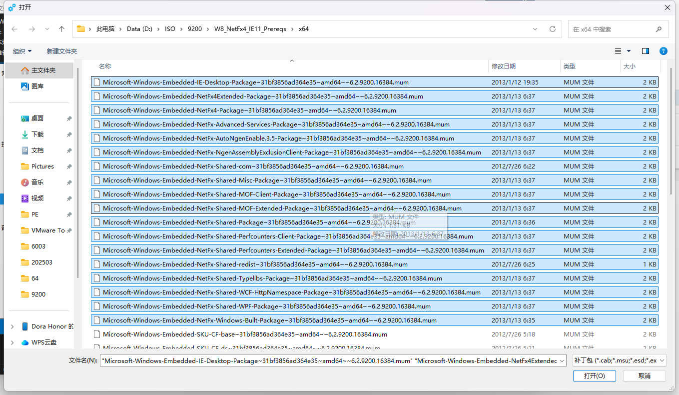 Microsoft-Windows-Embedded-IE-Desktop-Package~31bf3856ad364e35~amd64~~6.2.9200.16384.mum、Microsoft-Windows-Embedded-NetFx4Extended-Package~31bf3856ad364e35~amd64~~6.2.9200.16384.mum和以Microsoft-Windows-Embedded-NetFx4开头的更新补丁,单击【打开】安装 SKU 更新,等待一段时间。