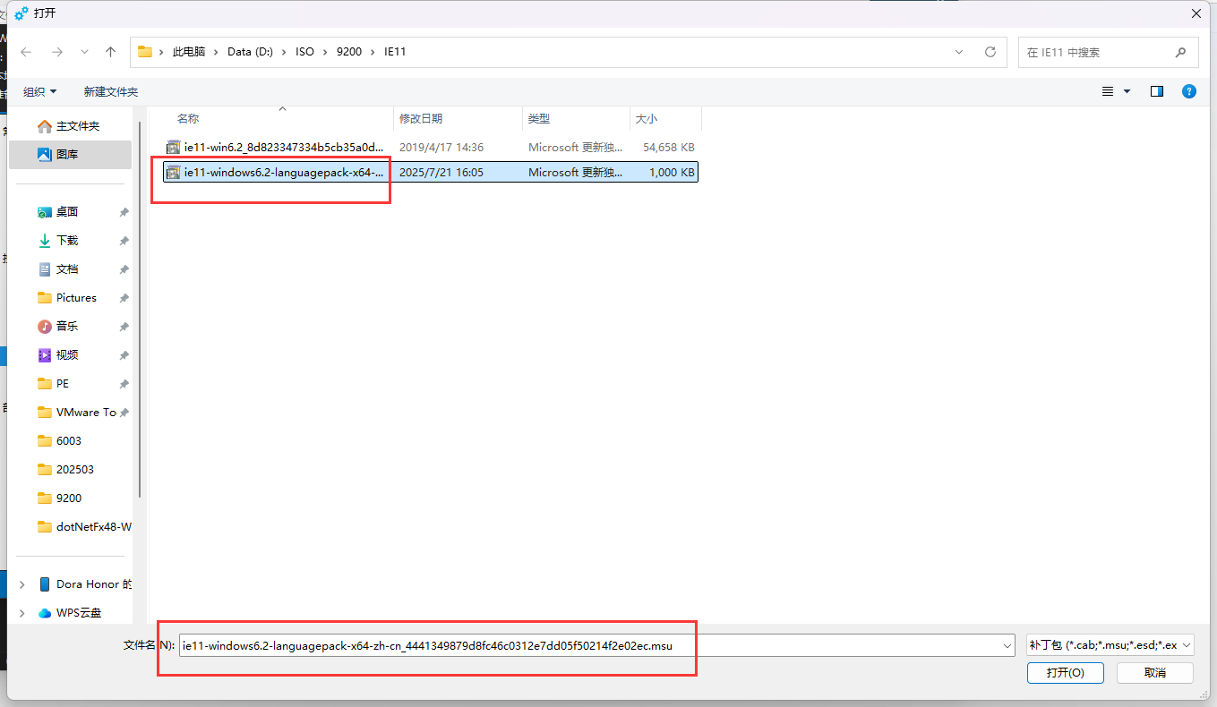 - 重复上述安装步骤,找到 IE 11 及语言包更新补丁所在位置,先选择