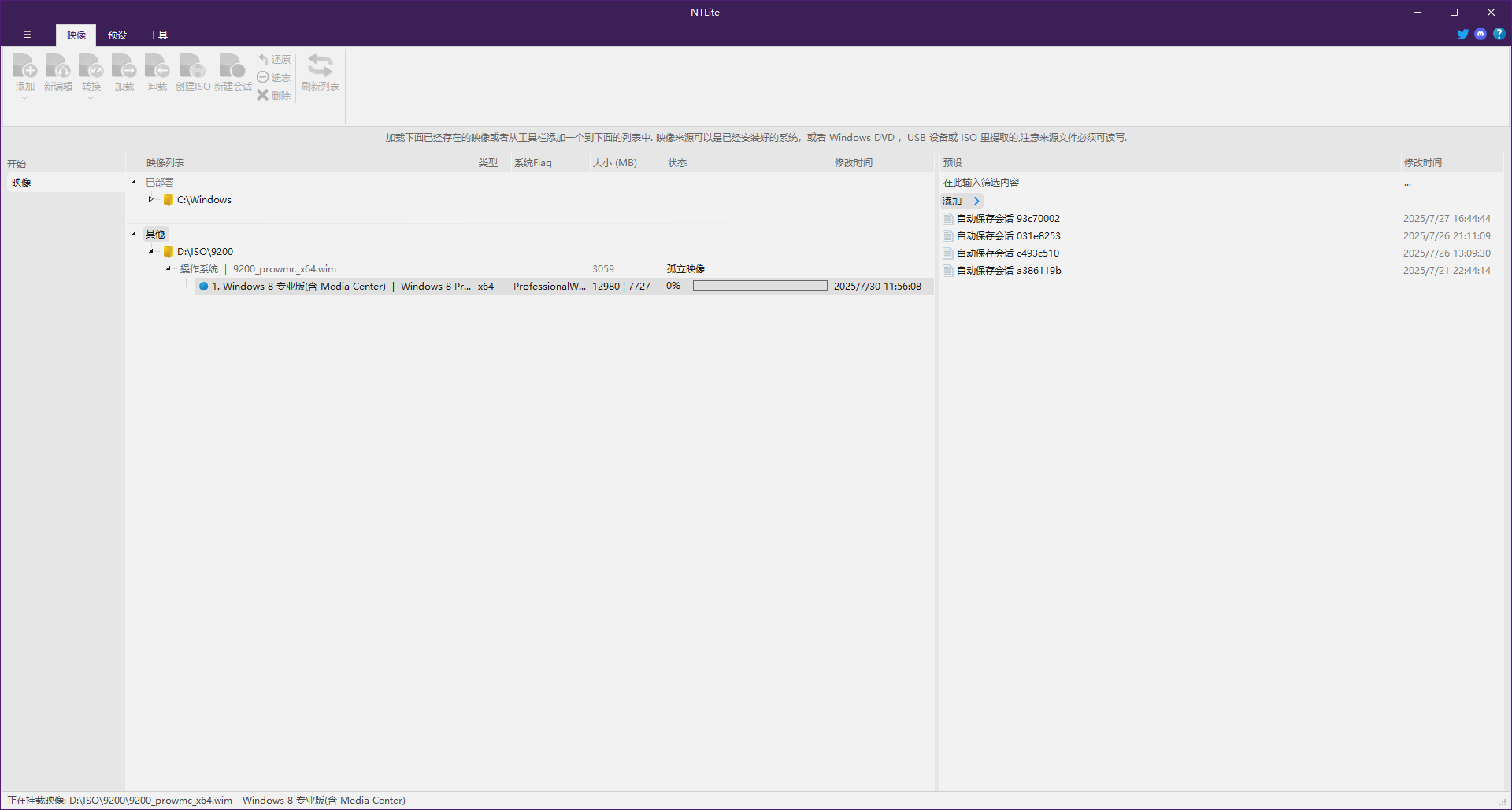 - 打开 NTLite,将 WIM 拖进窗口,双击分卷挂载 WIM。