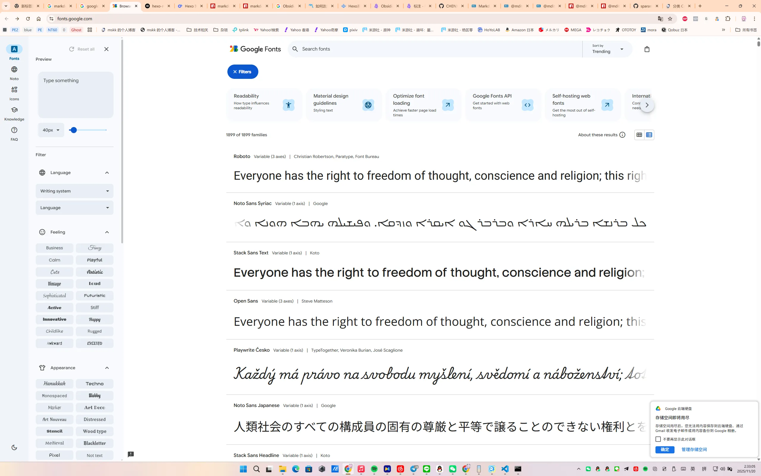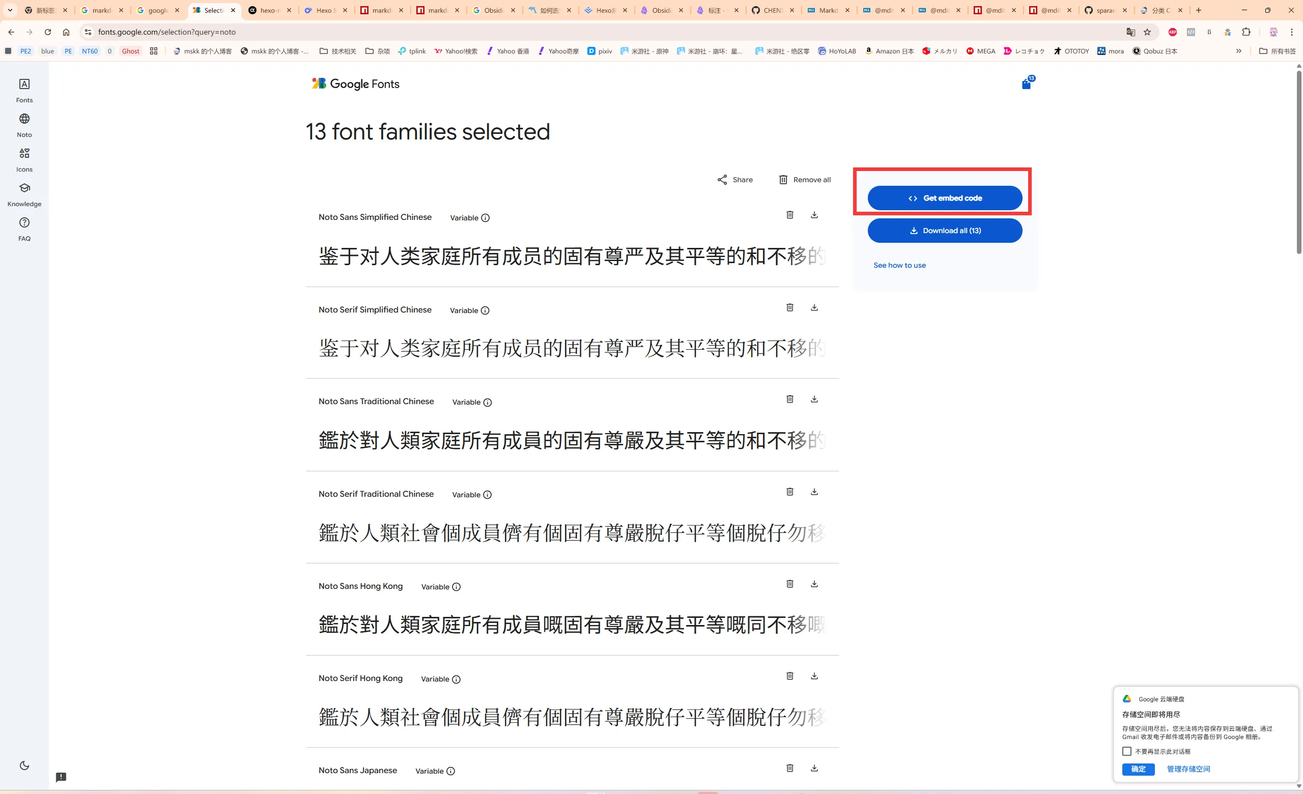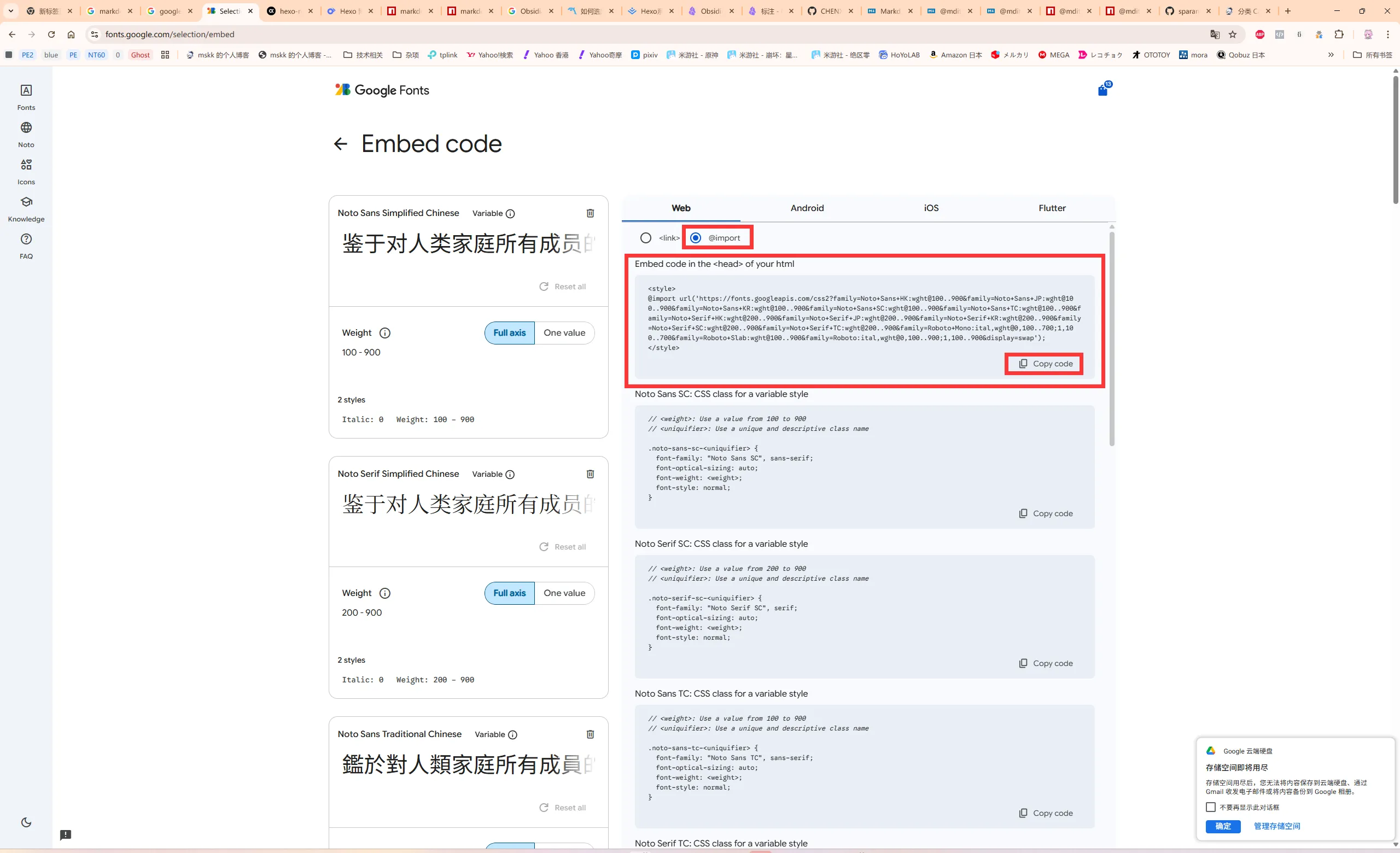 以我下载好的多字重 MiSans 字体和 Google Fonts 的 Noto Sans[1]/Serif[2] SC/TC/HK/JP/KR、Roboto、Roboto Slab、Roboto Mono 在线字体为例。